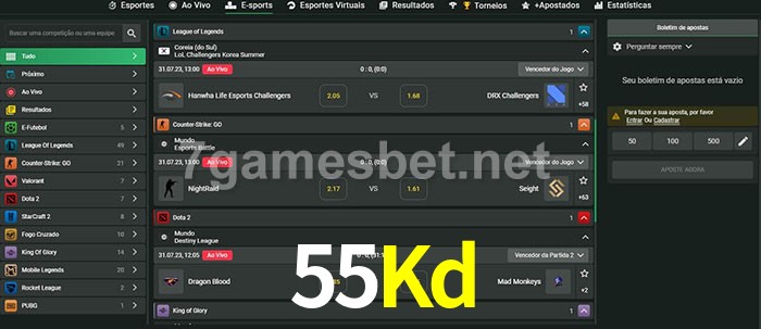 O 55Kd oferece uma grande seleção de opções de apostas em e-sports com probabilidades competitivas
